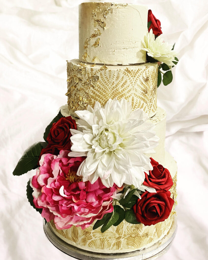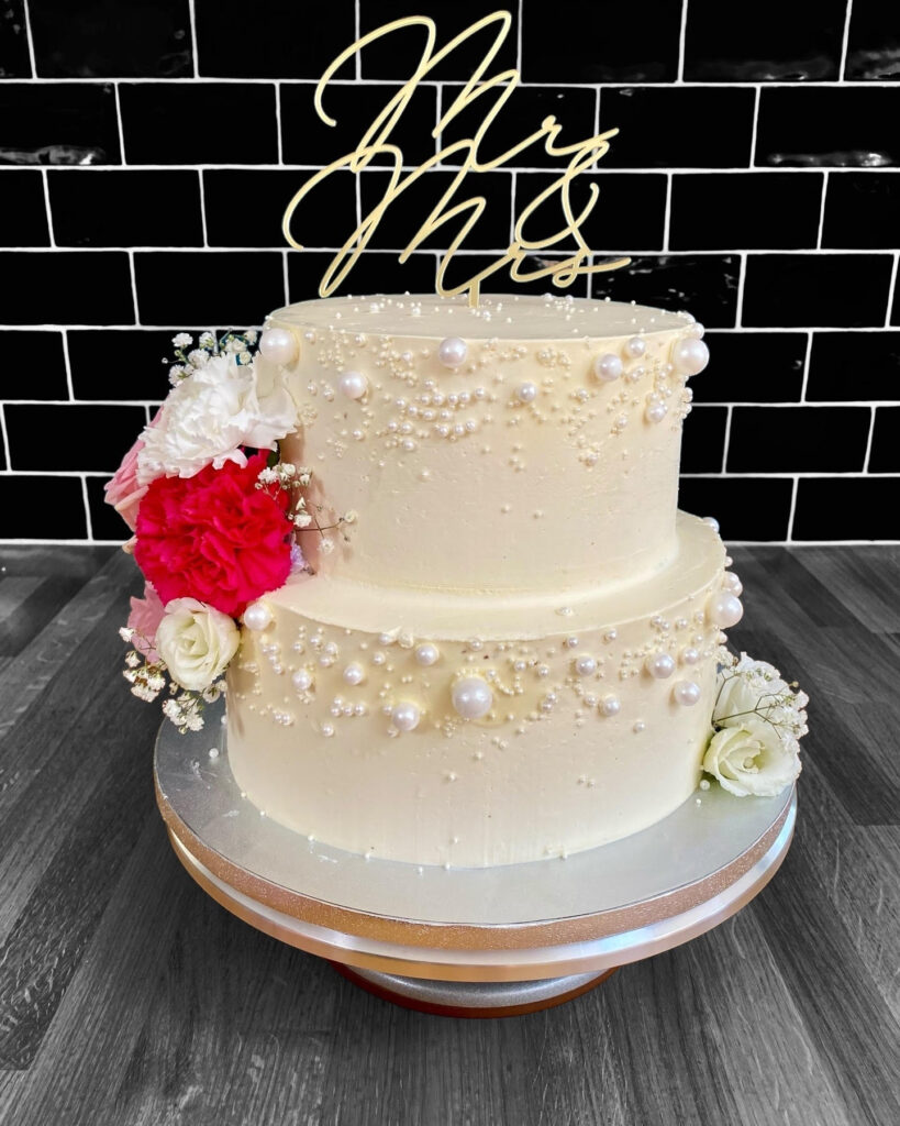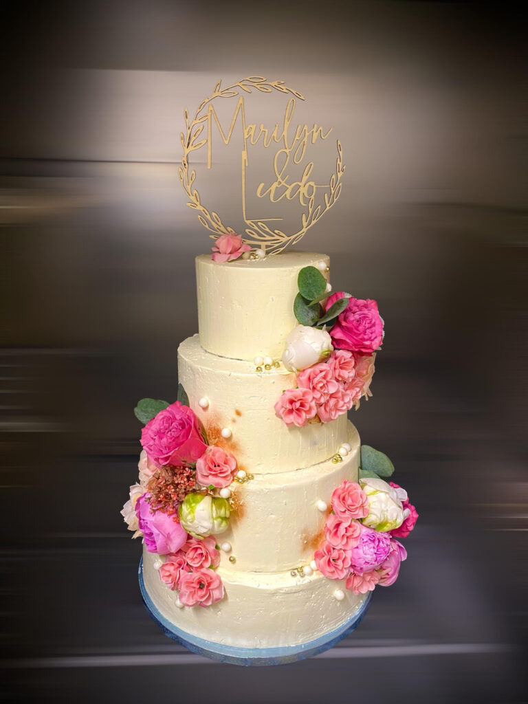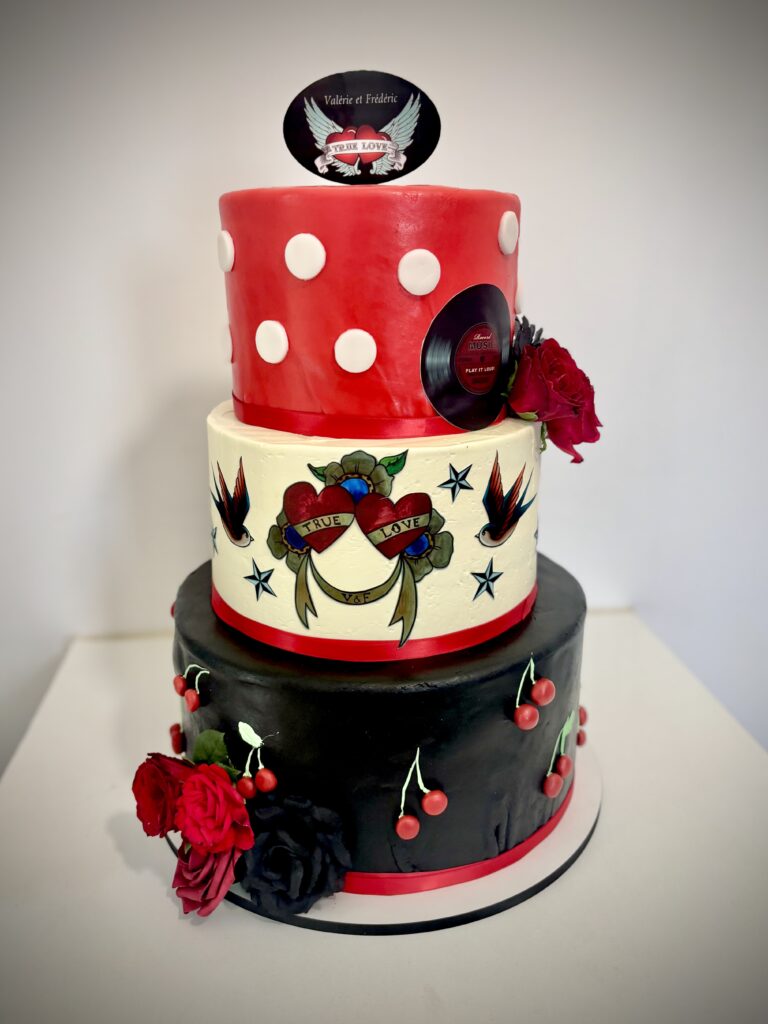 Le wedding cake (littéralement « gâteau de mariage ») nous vient directement des pays anglo-saxons. C’est un gâteau à étages composé de plusieurs couches de moelleux, de génoise, etc. séparées par de la crème ou de la ganache, recouvert de pâte à sucre ou, pourquoi pas, laissé nu. L’imagination est la seule limite quand on parle du design des wedding cakes.